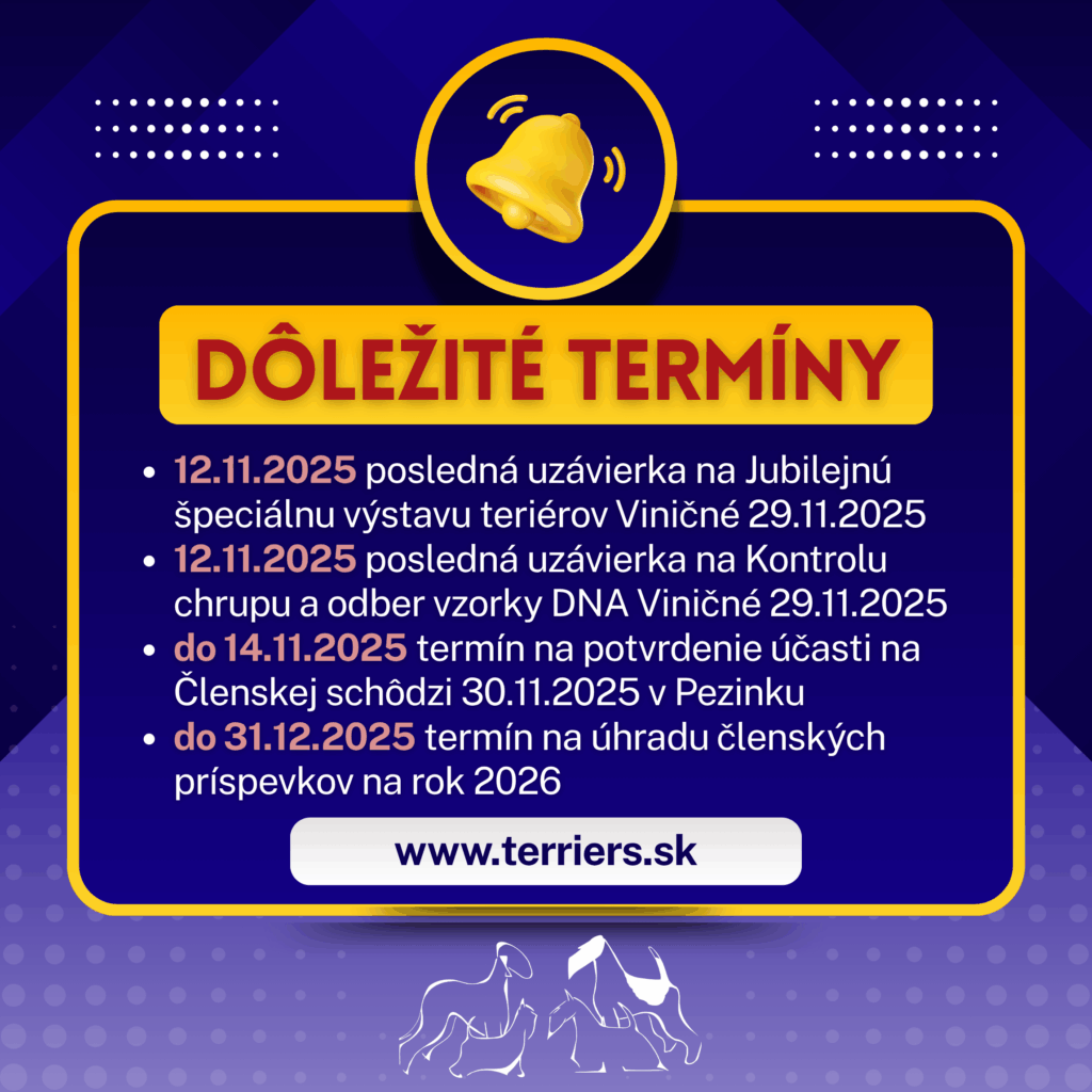 – 12.11.2025: posledná uzávierka na Jubilejnú špeciálnu výstavu teriérov, ktorá sa